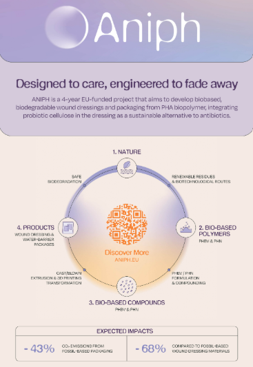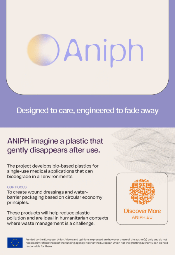 We are glad to introduce ANIPH, an EU-funded healthcare project developing next-generation wound dressings and recyclable water-barrier packaging. Our products are made from bio-based materials that safely biodegrade in the environment, including soil, freshwater, and the ocean. This solution is especially relevant in humanitarian contexts where waste collection and recycling are challenging.